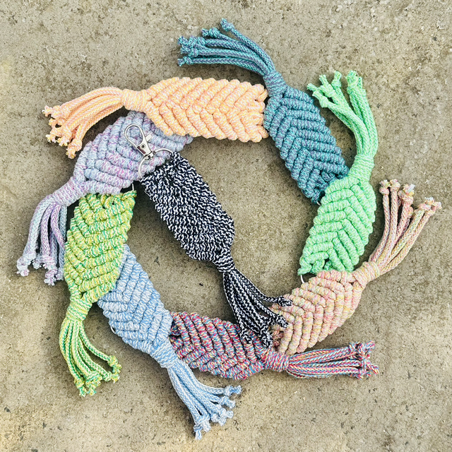 Handmade by myself, using premium blended cotton cord, hung on a D-ring with lobster claw clasp.