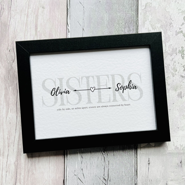Stylish wall art A5 print featuring ‘SISTERS’ wording with quote and personalised names. Sold unframed, printed on premium 300gsm hammered card.